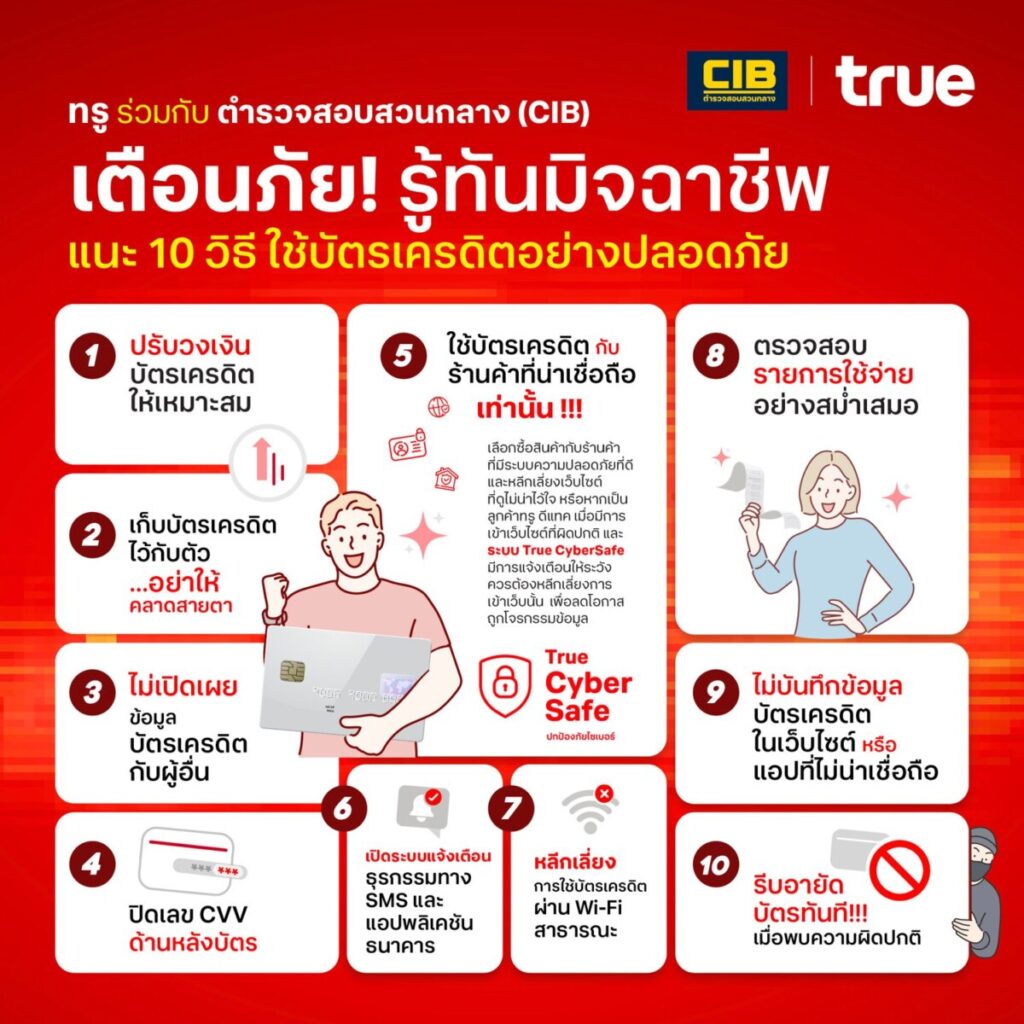 ในยุคที่ธุรกรรมออนไลน์และการใช้บัตรเครดิตเป็นเรื่องปกติ มิจฉาชีพก็พัฒนากลโกงหลากหลายรูปแบบเพื่อหลอกลวงผู้ใช้บัตรเครดิต ทรู ร่วมกับ ตำรวจสอบสวนกลาง (CIB) แนะนำ 10 วิธีใช้บัตรเครดิตอย่างปลอดภัย ป้องกันภัยจากมิจฉาชีพ