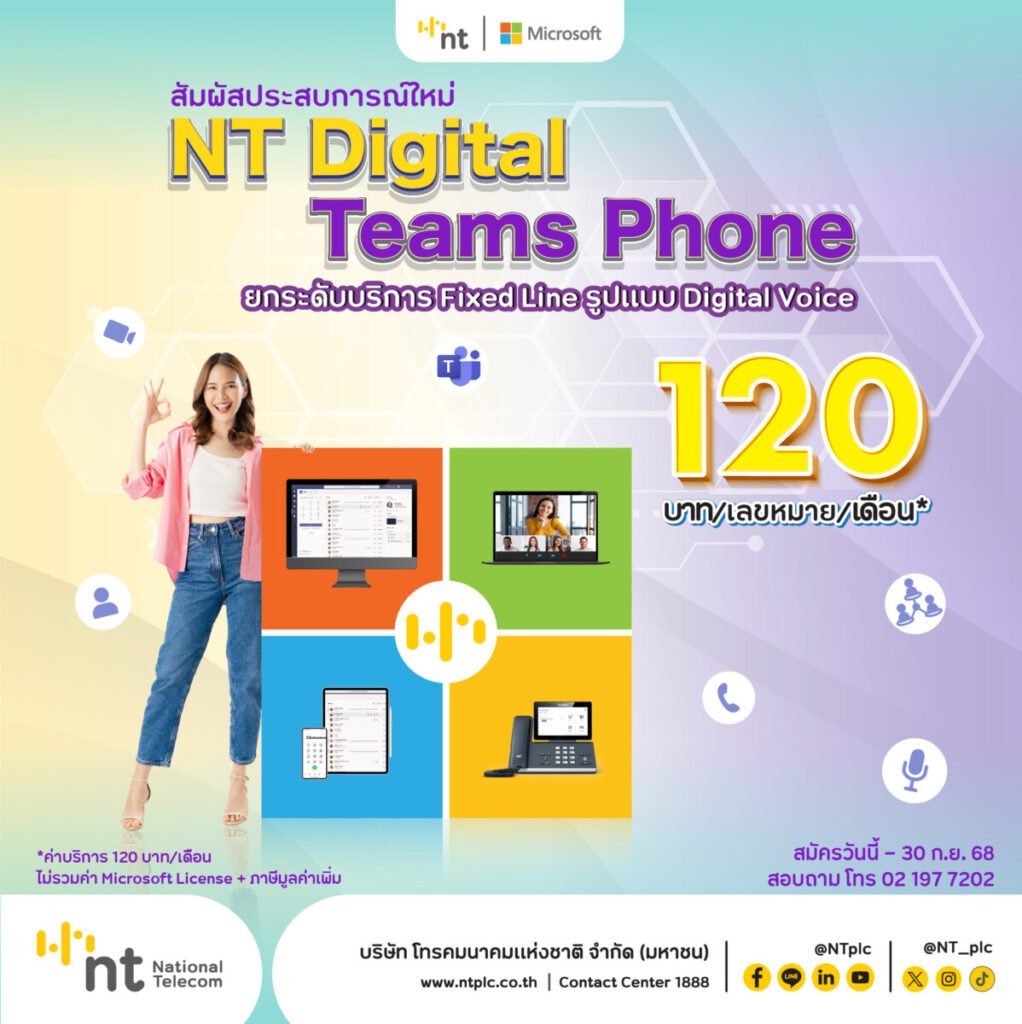ลูกค้าสามารถสมัครใช้บริการ NT Digital Teams Phone ได้ตั้งแต่วันนี้ถึง 30 กันยายน 2568 ค่าบริการรายเดือนเพียง 120 บาทต่อเลขหมายต่อเดือน (ไม่รวม Microsoft License) สอบถามข้อมูลเพิ่มเติม โทร. 02-197-7202 หรือ 1888 หรือเยี่ยมชมเว็บไซต์ www.ntplc.co.th