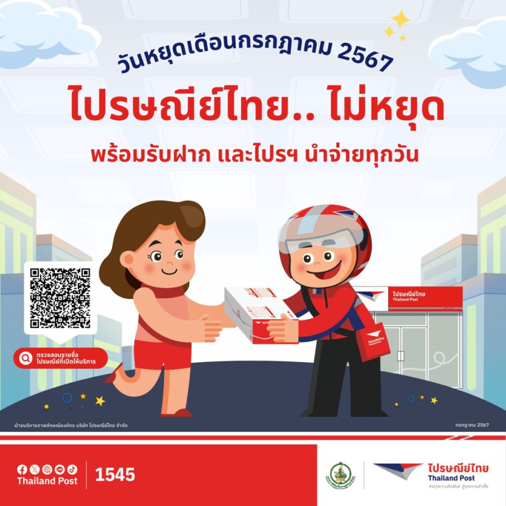 บริษัท ไปรษณีย์ไทย จำกัด เปิดให้บริการรับฝากและนำจ่ายปกติทั่วประเทศ ในวันหยุดต่อเนื่องวันอาสาฬหบูชาและวันเข้าพรรษา ซึ่งในปีนี้ตรงกับวันเสาร์ที่ 20 กรกฎาคม – วันจันทร์ที่ 22 กรกฎาคม 2567 รวมถึงวันเฉลิมพระชนมพรรษาพระบาทสมเด็จพระวชิรเกล้าเจ้าอยู่หัว รัชกาลที่ 10 ในวันเสาร์ที่ 27 กรกฎาคม – วันจันทร์ที่ 29 กรกฎาคม 2567 โดยเปิดให้บริการที่ไปรษณีย์จังหวัดทุกแห่ง ไปรษณีย์ขนาดใหญ่ในเขตกรุงเทพฯ ปริมณฑล และต่างจังหวัด ไปรษณีย์ในห้างสรรพสินค้า ไปรษณีย์ในท่าอากาศยาน และสถานีบริการน้ำมัน เพื่ออำนวยความสะดวกแก่ผู้ใช้บริการที่ต้องการฝากส่งสิ่งของในทุกพื้นที่ในช่วงวันหยุดยาว เพื่อให้กิจกรรม ไลฟ์สไตล์และการดำเนินธุรกิจเป็นไปอย่างต่อเนื่อง