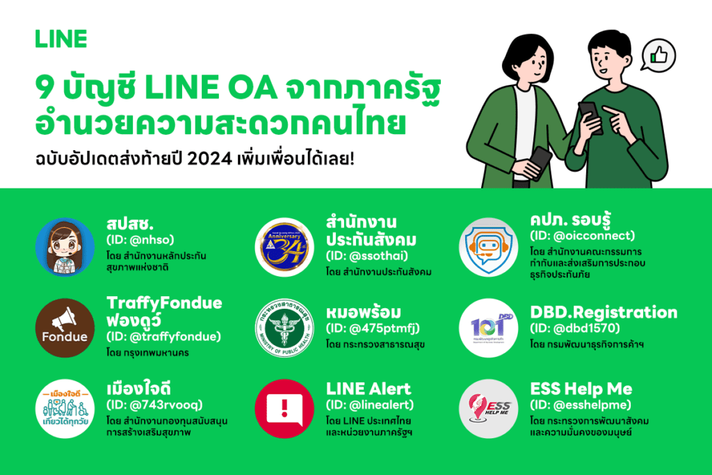 LINE ประเทศไทย เผยโฉม 9 บัญชี LINE OA จากหน่วยงานภาครัฐ ส่งท้ายปี 2024 เพื่อตอบโจทย์การใช้ชีวิตดิจิทัลของคนไทยกว่า 56 ล้านคน ให้สะดวกและเข้าถึงบริการสำคัญได้ง่ายขึ้น ไม่ว่าจะเป็นข้อมูลสุขภาพ การแจ้งเตือนเหตุฉุกเฉิน การตรวจสอบสิทธิประโยชน์ หรือการขอรับบริการต่าง ๆ